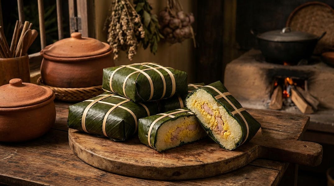 In the days before Tết—Vietnam's Lunar New Year—every Vietnamese household transforms into a workshop where generations gather to fold, wrap, and steam bánh chưng, the iconic square rice cakes that symbolize gratitude to ancestors and the earth itself. From the legend of Prince Lang Liêu to the overnight vigil by boiling pots, discover how this humble cake of sticky rice, mung beans, and pork has anchored Vietnamese identity for millennia.